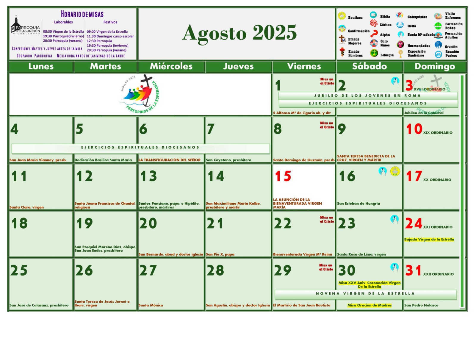 Comenzamos el mes de agosto, que es posiblemente la época en la que la actividad pastoral disminuye para dar paso a las vacaciones. A finales de mes, comienzan los actos en honor a la Virgen de la Estrella, que se adelantarán un poco con motivo del XXV Aniversario de la Coronación Canónica.