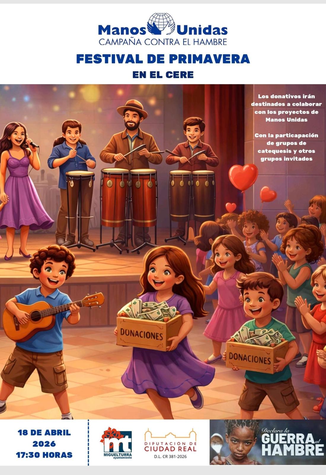Como cada año, Manos Unidas Miguelturra celebra su ya tradicional Festival de Primavera en el que grupos de catequesis nos deleitarán con sus actuaciones.
